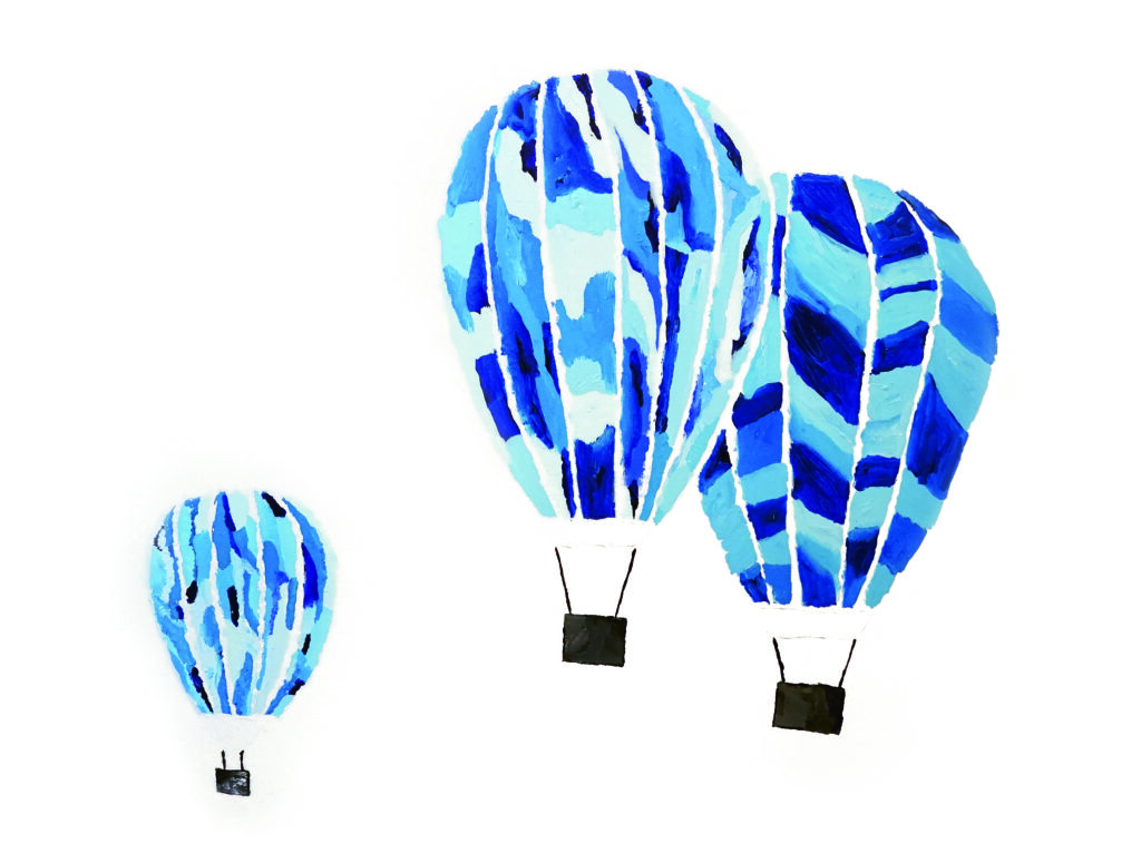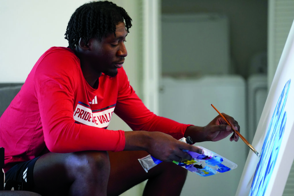 In his free time – which isn’t much as a major college basketball student- athlete – Andre makes time for his art. His latest project, which he’s worked on for numerous days in the living room of his Clovis apartment, is a large canvas painting of three hot air balloons drifting in open air. Andre says the hot air balloons represent the frequent childhood dreams he had about flying – though he’s afraid of heights – and the various shades of blue on the balloons represent the sky.