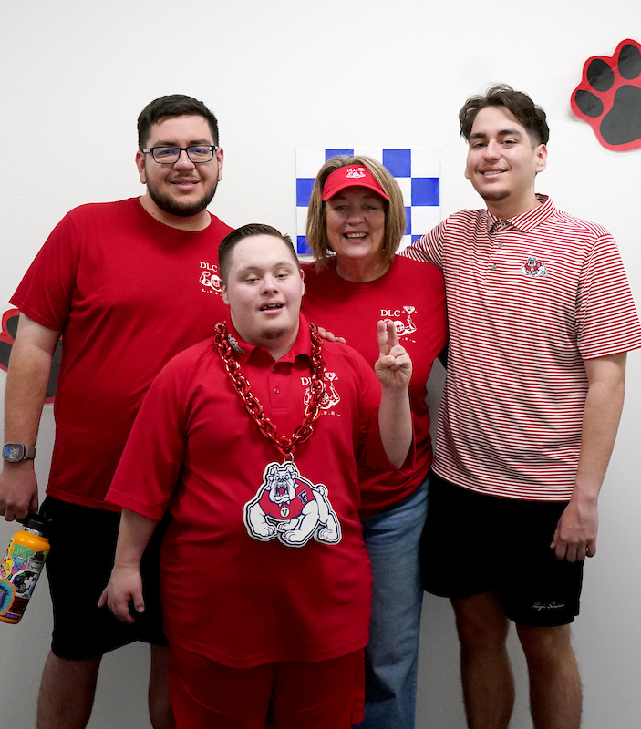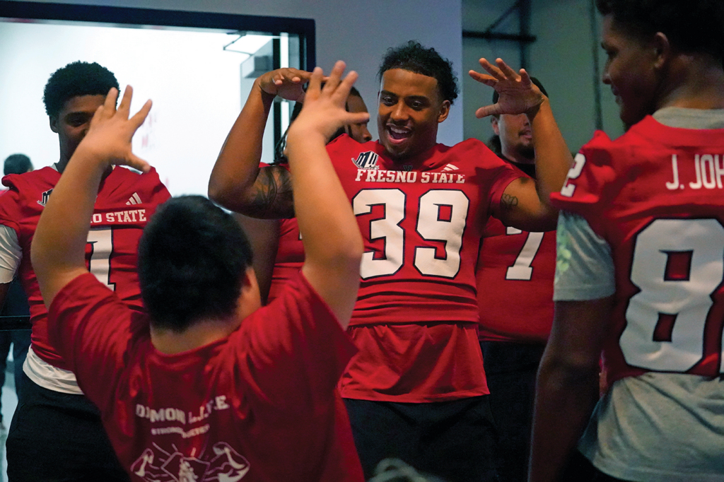 The energy was electric at the Diamond Learning Center’s event venue on Sept. 25. Red and blue stage lights, strobes and Bulldog signage set the scene while songs like “Who Let the Dogs Out,” “Macarena” and “Gasolina” rocked the dance floor. The center’s students cheered and blitzed toward the entryway as Fresno State football players and dance team members entered the dance floor, generously passing out high-fives, fist bumps and hugs before dancing alongside the students.