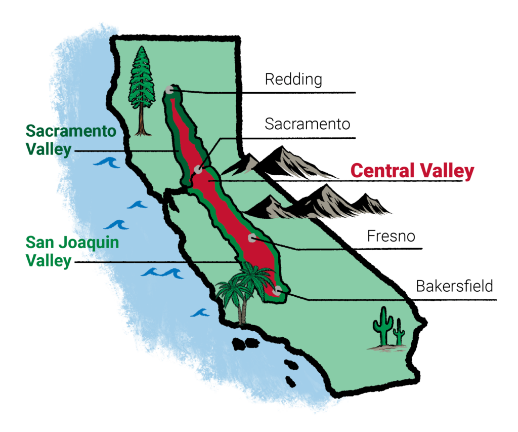 Geographically, the Central Valley stretches 450 miles from Redding to Bakersfield, hemmed in by the Coast Ranges to the west and the Sierra Nevada to the east. It is divided into two large parts — the northern one-third is known as the Sacramento Valley and the southern two-thirds is known as the San Joaquin Valley. Within the San Joaquin Valley, Fresno is the largest city, a crossroads where northern and southern California influences mingle.
