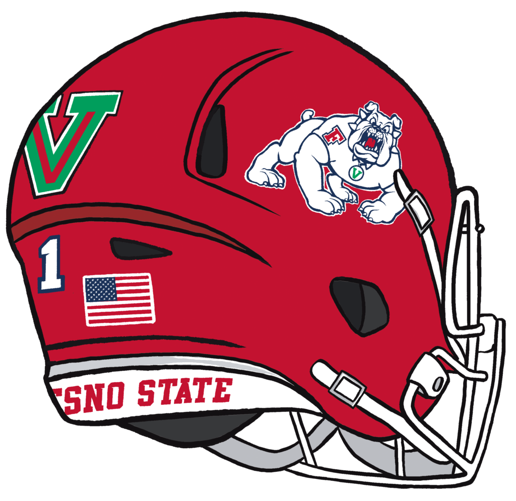 The Green V featured on the back of Fresno State’s football helmets and on the collar of the official four-paw logo symbolizes the pride Fresno State takes in representing the Central Valley. The V is green in recognition of the Valley being the leading agricultural region in the United States, and it has a Bulldog Red line through the middle, symbolizing Fresno State’s place in the center of the Valley.